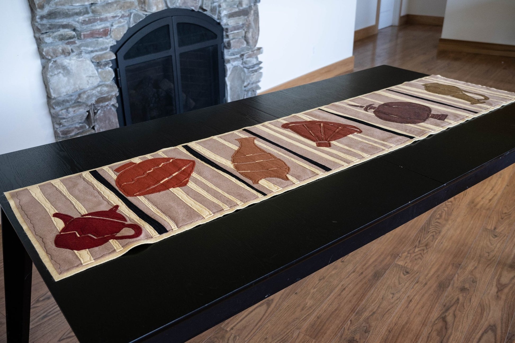 Ancient pottery adorns this table runner -cracks and all. All wool felt runners are crafted as felt appliqué collages. Minor variations enhance the beauty of these one-of-a-kind pieces.