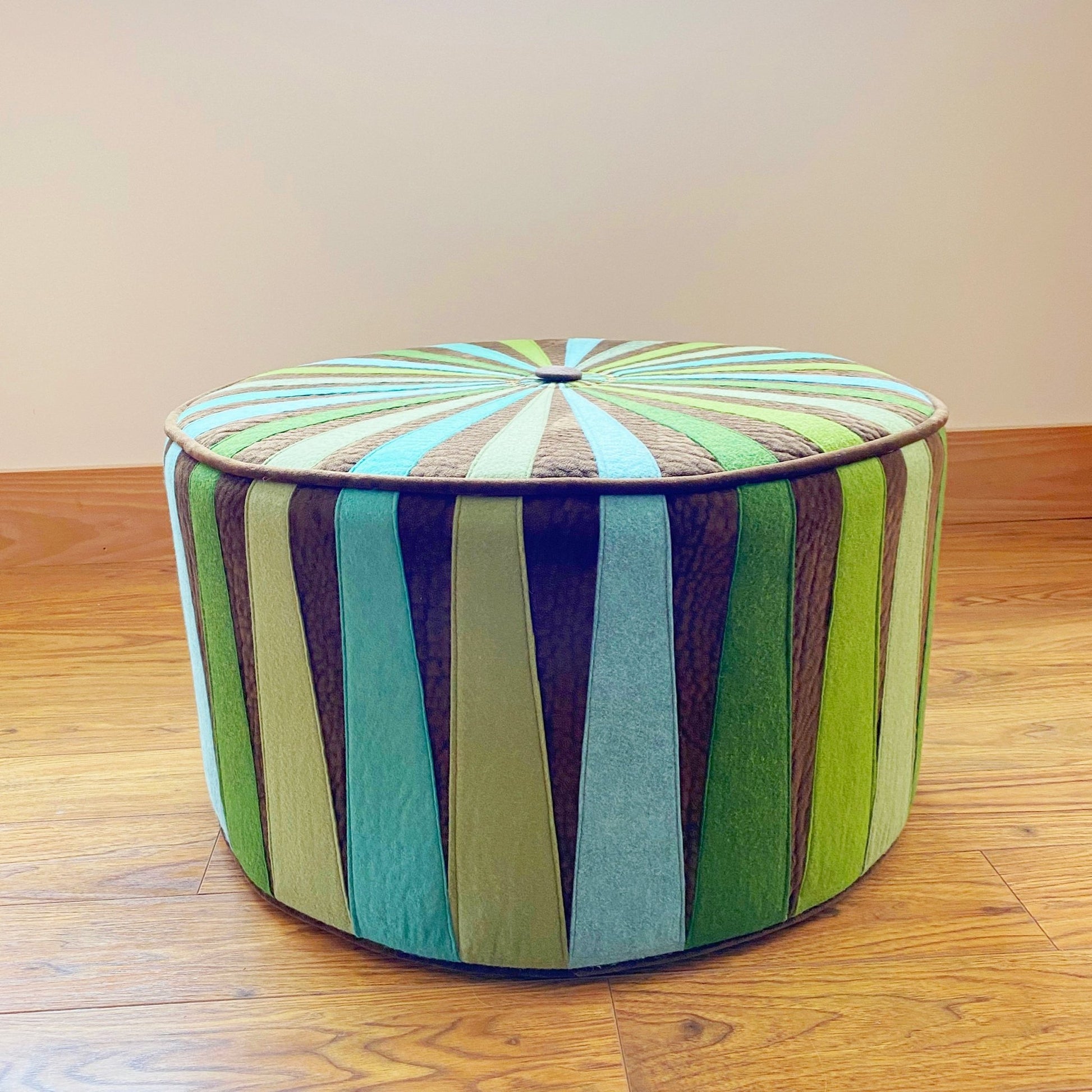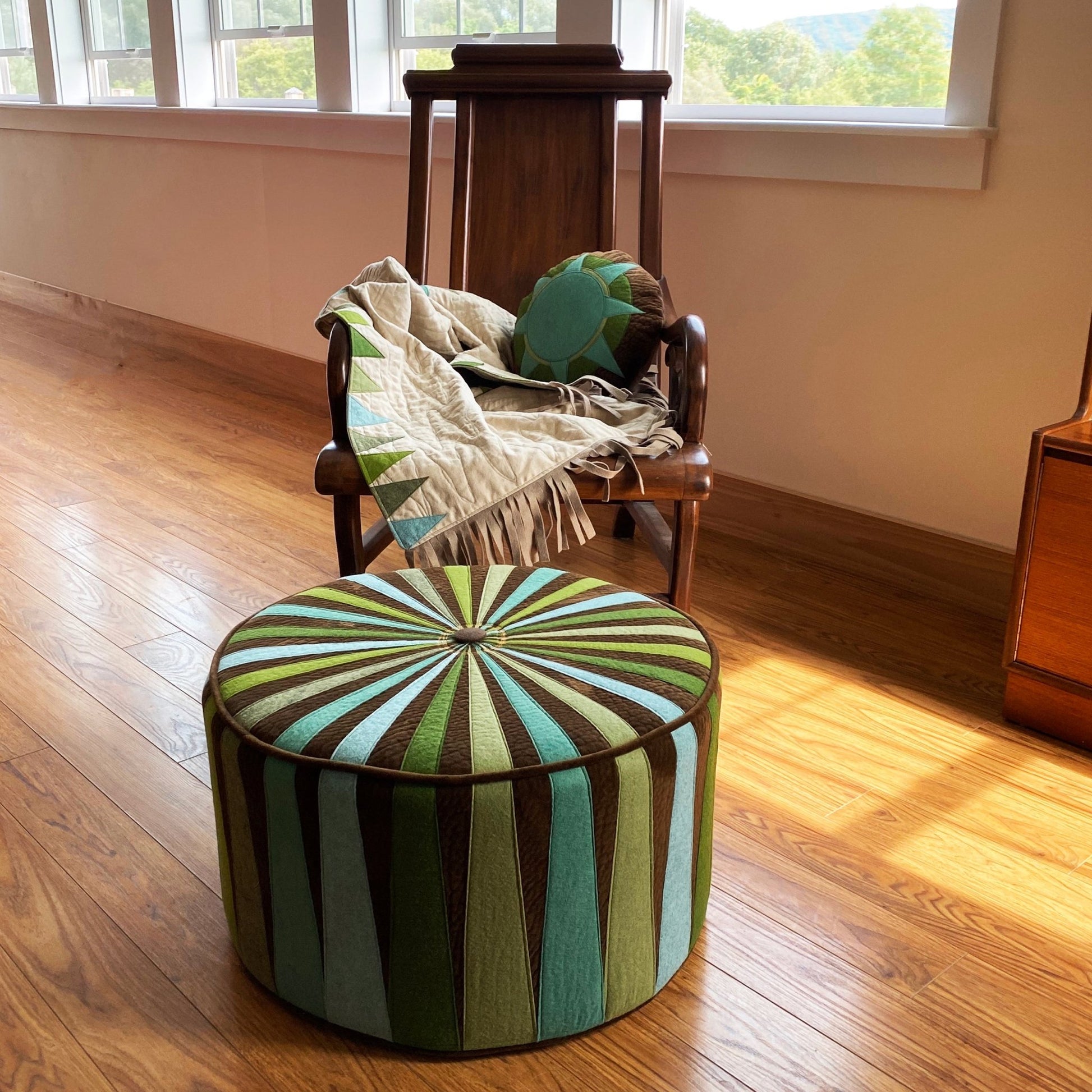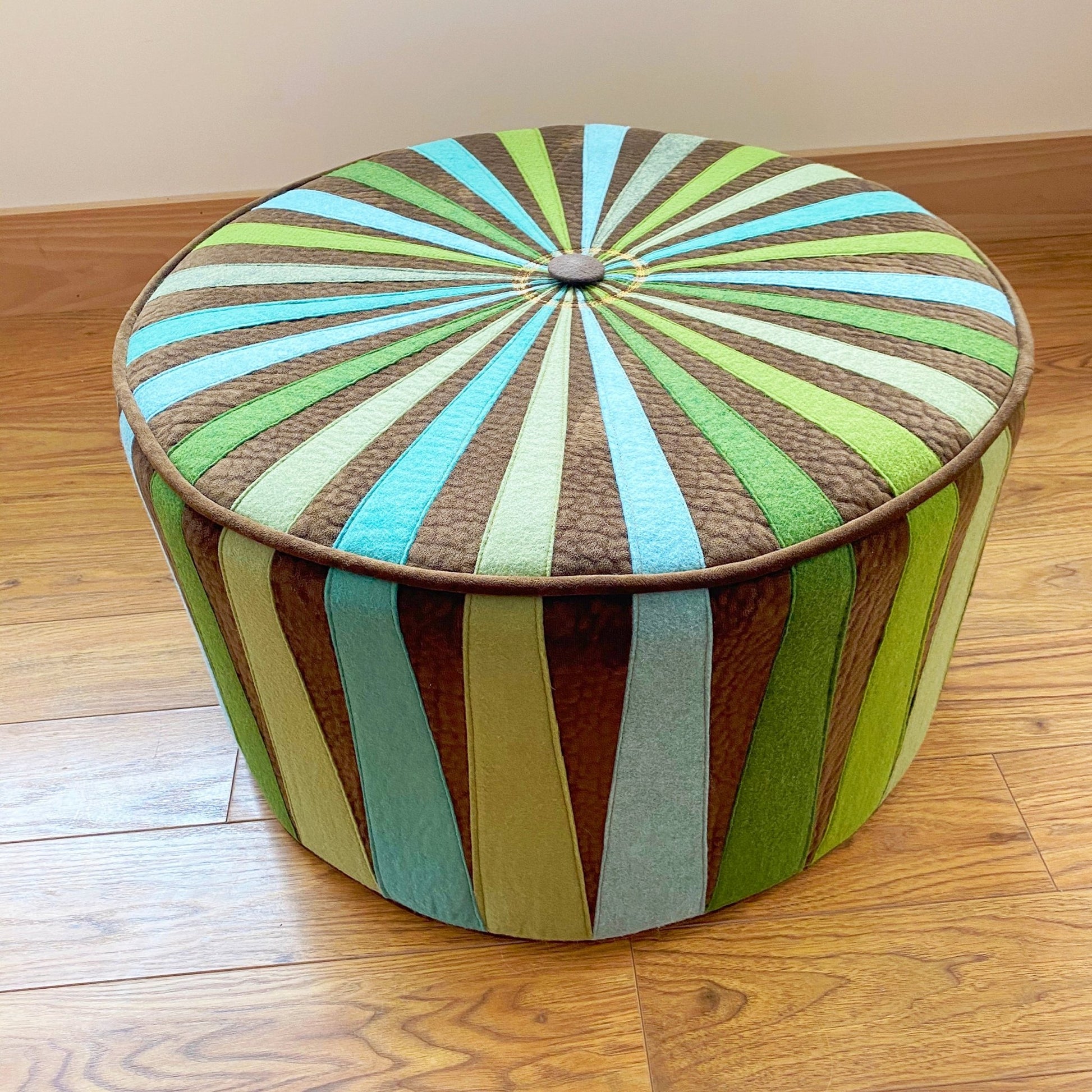 This comfortable round ottoman features a radial pattern in greens on brown velvet. Sit on it or put your feet up! Solid foam form with wooden bottom and sliders. One-of-a-kind.