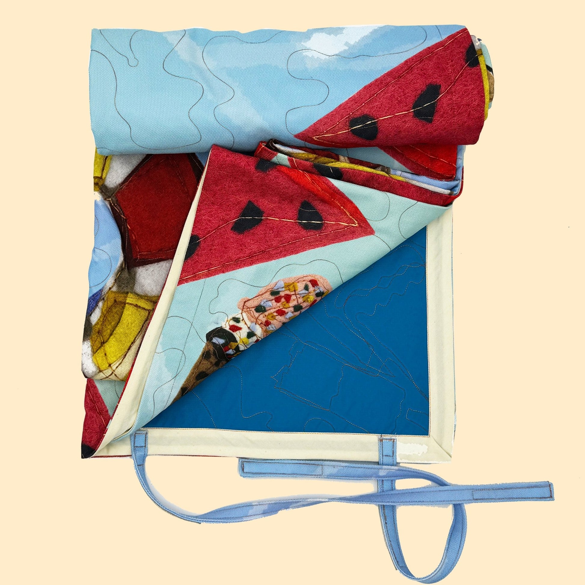 This darling picnic blanket is rugged and will keep your bottoms dry with a ripstop nylon backing. Whether by the pool, seashore or your backyard you will feel like you are floating in the sunshine. Attached straps allow you to roll it up into a neat bundle for easy carrying. Don't forget the beach bag!