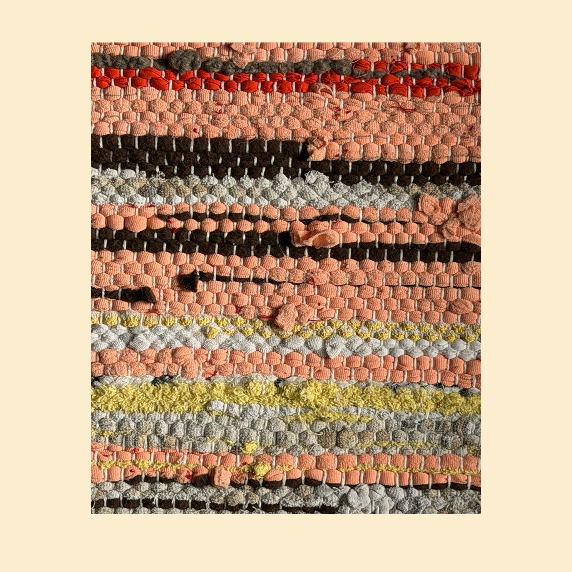 One-of-a-kind small, durable, handmade rag rug, made in the U.S.A. Sustainably produced from socks, towels and other household materials that are normally thrown away. Orange, white multicolor textiles create the design in this rug.